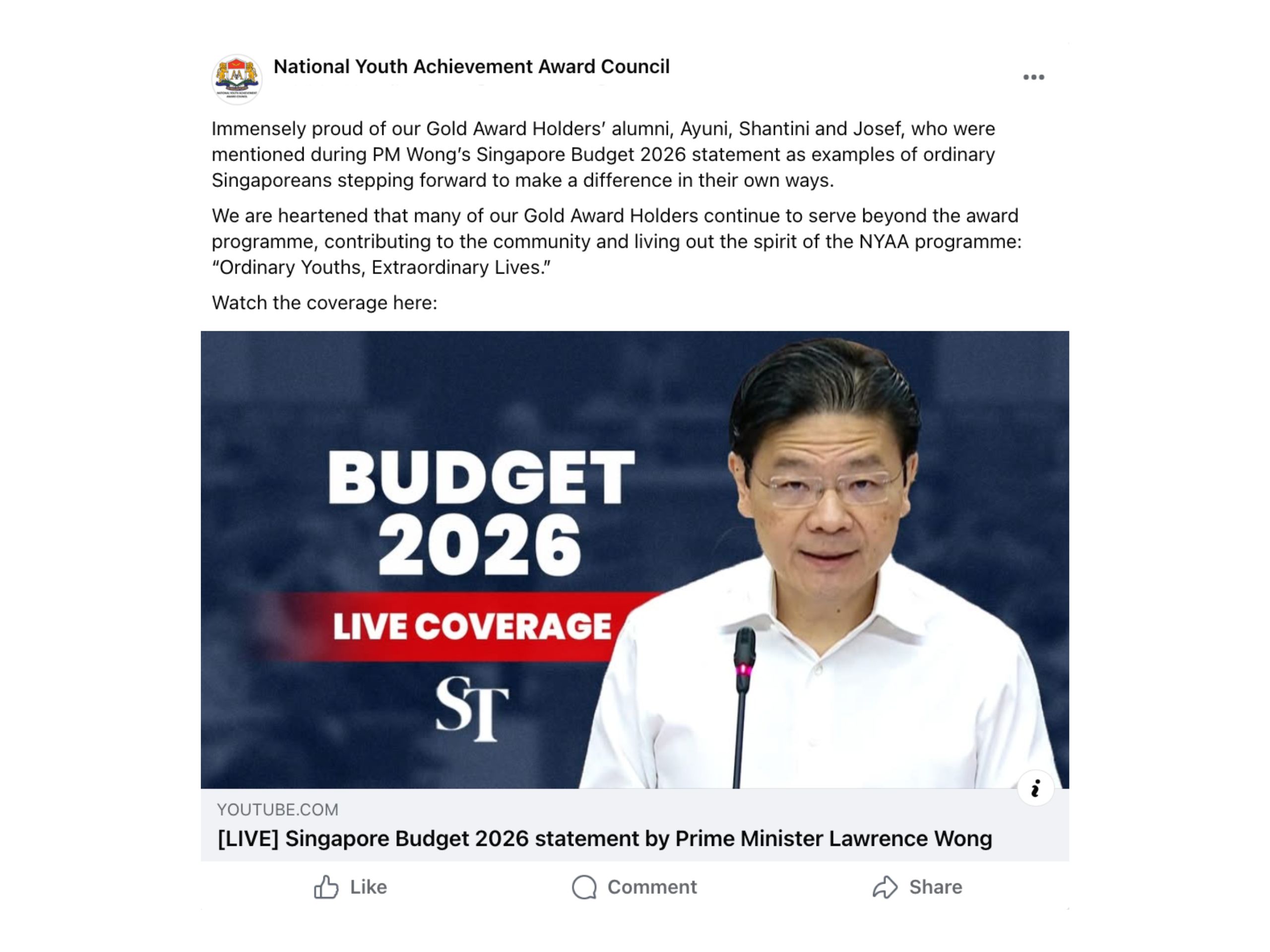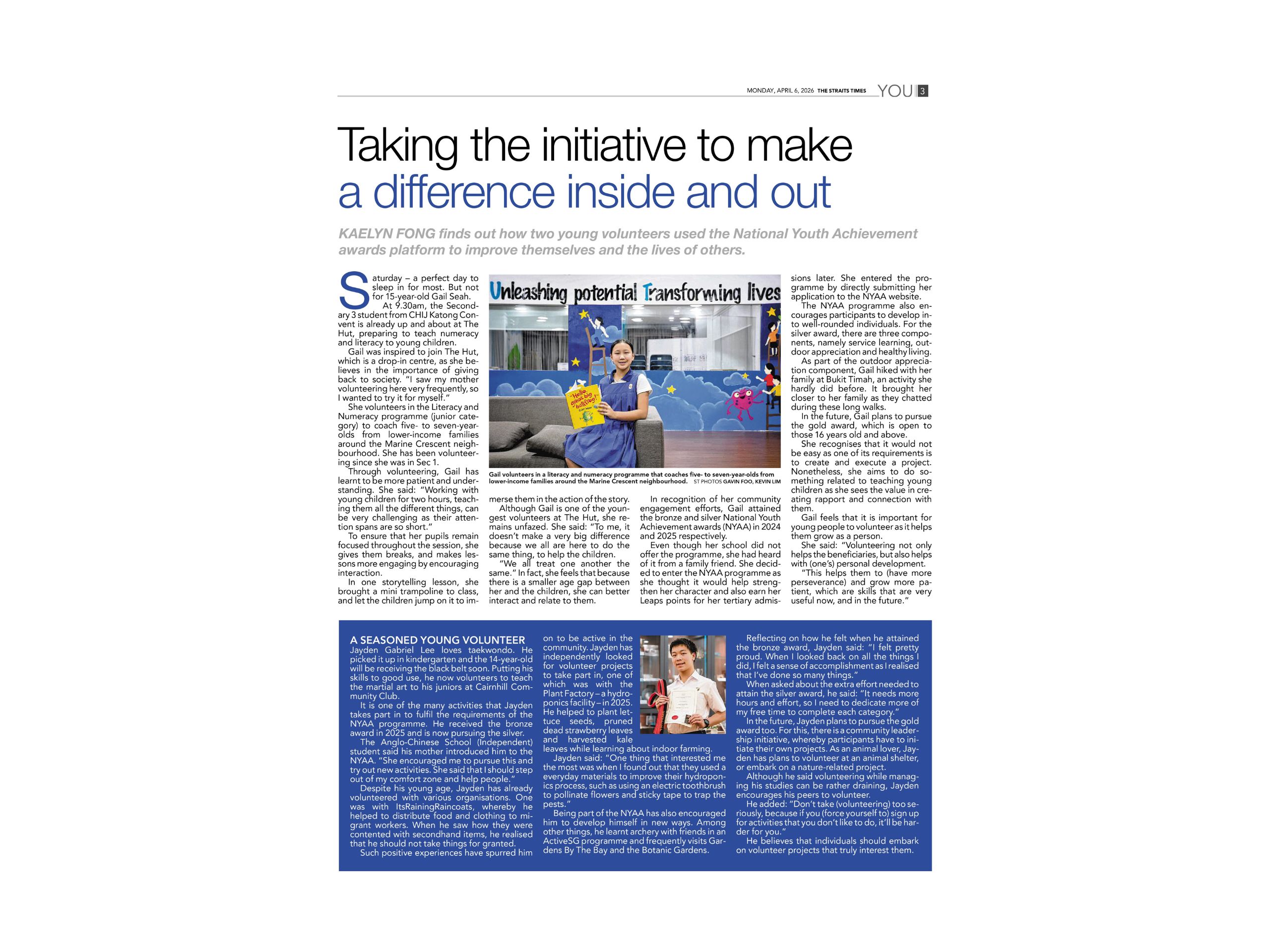 Media Releases & Press Features [ST IN Feature] Gail Seah (CHIJ Katong Convent) & Jayden Gabriel Lee (Anglo-Chinese School (Independent)) [Singapore Budget 2026] Examples of inspiring Ordinary Youths: NYAA Gold Award Recipients (2025) [LHZB] 10th St Gallen Symposium Singapore Forum [Mothership] 10th St Gallen Symposium Singapore Forum [Finews.asia] 10th St Gallen Symposium Singapore Forum [Announcement] Singapore-China NETS FlashPay Card Design Competition Results [Straits Times] 23rd NYAA Gold Award Presentation Ceremony [TL;DR] Interview with Ayuni Nur Izyanti (NYAA Gold Award Recipient 2025) [Lianhe Zaobao] 23rd NYAA Gold Award Presentation Ceremony [Berita Mediacorp] 23rd NYAA Gold Award Presentation Ceremony [Lianhe Zaobao] Interview with Josef Tan (NYAA Gold Award Recipient 2025) [China Daily] Singapore-China Youth Leadership Forum 2025 [ZB Schools] Singapore’s Hawker Culture & Heritage Storytelling Project 2025 [8worldnews] Singapore’s Hawker Culture & Heritage Storytelling Project 2025 [Berita Mediacorp] Singapore’s Hawker Culture & Heritage Storytelling Project 2025 [Business Times] HSBC NYAA ITE SME Sustainability Initiative 2025 [Lianhe Zaobao] HSBC NYAA ITE SME Sustainability Initiative 2025 [Lianhe Zaobao] NYAA Handover Ceremony 2025 [8worldnews] NYAA Handover Ceremony 2025 [Straits Times] Singapore-China Young Global Leaders Forum 2025 [Lianhe Zaobao] Singapore-China Young Global Leaders Forum 2025 [Lianhe Zaobao] St Gallen Symposium Singapore Forum 2025 [Mothership] St Gallen Symposium Singapore Forum 2025 [8worldnews] 22nd NYAA Gold Award Presentation Ceremony [Berita Mediacorp] 22nd NYAA Gold Award Presentation Ceremony [Tamil Murasu] Interview with Shantini D/O Subramaniam (NYAA Gold Award Recipient 2025) [Lianhe Zaobao] 21st NYAA Gold Award Presentation Ceremony [Lianhe Zaobao] Interview with Christina Gan (NYAA Gold Award Recipient 2024) [CNA 938] Radio Interview with Chia Kwan Hi (NYAA Gold Award Recipient 2024) HSBC contributes more than S$500,000 to sustainability initiatives since 2020 (businesstimes.com.sg) [CNA] 21st NYAA Gold Award Presentation Ceremony [Berita Mediacorp] Interview with NYAA Gold Award Recipient Khalid Abdul Rashid Email nyaac@singnet.com.sg enquiries@nyaac.sg Contact No +65 6733 6753 aDDRESS 151 Lorong Chuan, #06-01B Lobby A, New Tech Park Singapore 556741 FOLLOW US NYAA GAHA Facebook NYAA GAHA Instagram NYAA GAHA LinkedIn Group FollowFollowFollow About NYAA NYAA Programme FAQs The Butterfly Award FAQs GAHA FAQs NYAA in the Media Financial Information Contact Us